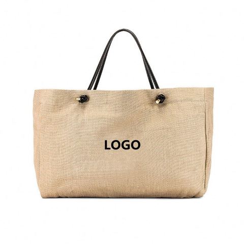 Bolso grande de lona de algodón y lino de yute para mujer a la moda con asas de cuero genuino, bolso de hombro para fin de semana
